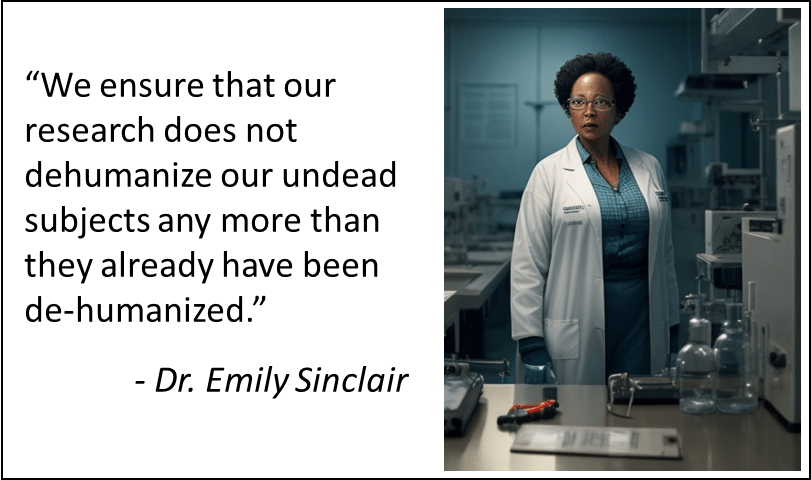 I also get asked a lot about the question of consent. Obviously, zombies cannot provide informed consent to be experimented on. So we rely on our guidelines that prioritize their ethical treatment, and we ensure that our research does not dehumanize our undead subjects any more than they already have been de-humanized.