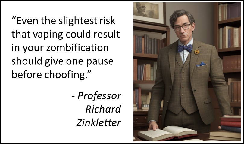 “If it’s not enough that e-cigarette users risk asthma, lung scarring, organ damage, cancer and death by explosion, even the slightest risk that vaping could result in your zombification should give one pause before choofing,” Zinkletter said.